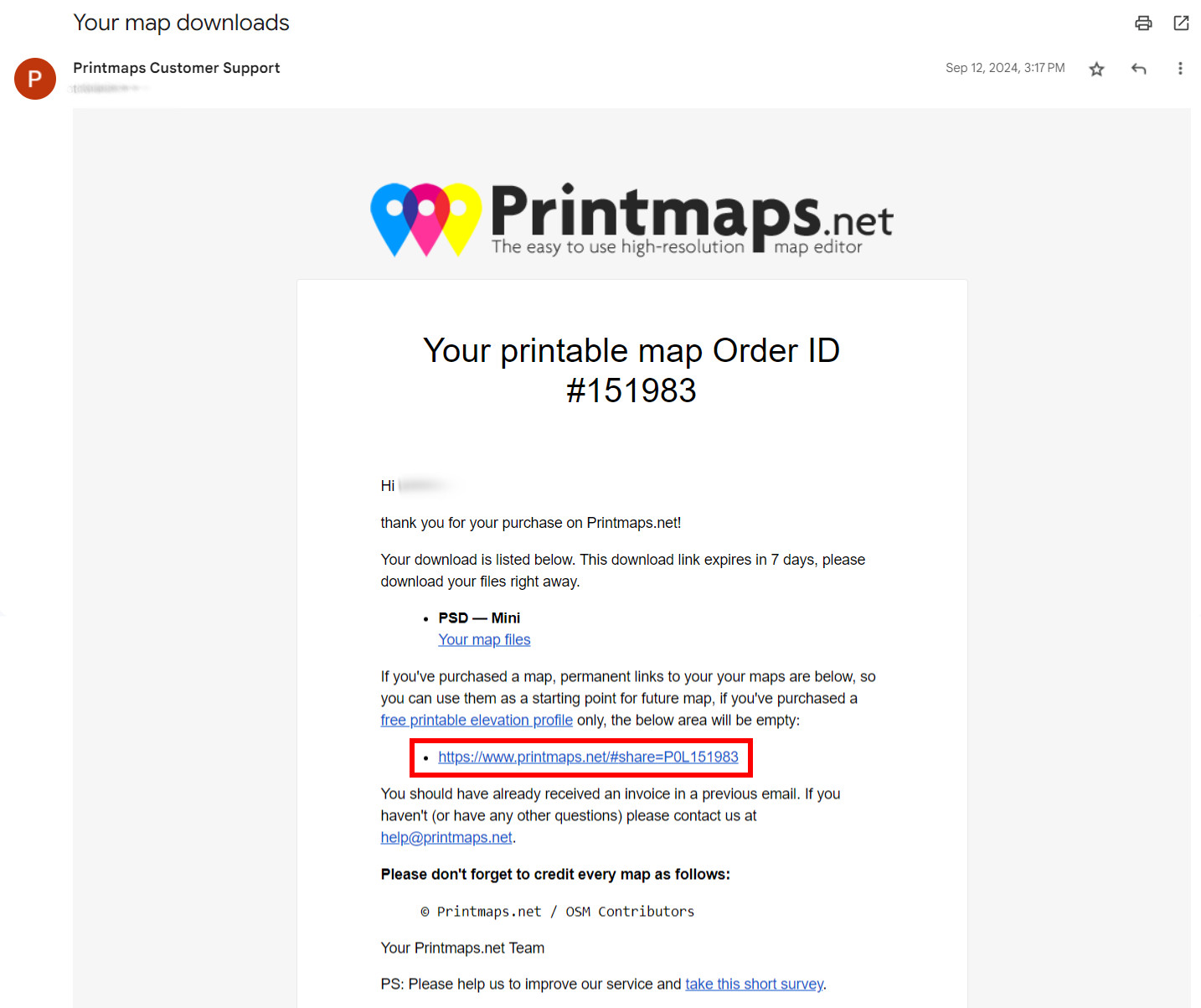 Her harita satın alımında ayrıca, indirme dosyalarıyla birlikte, haritanızın tüm ayarlarını ve verilerini tekrar açmanızı sağlayan bir kalıcı bağlantı içeren e-posta da alırsınız. Bu sayede önceki bir haritayı temel alarak yeni bir harita oluşturabilirsiniz.