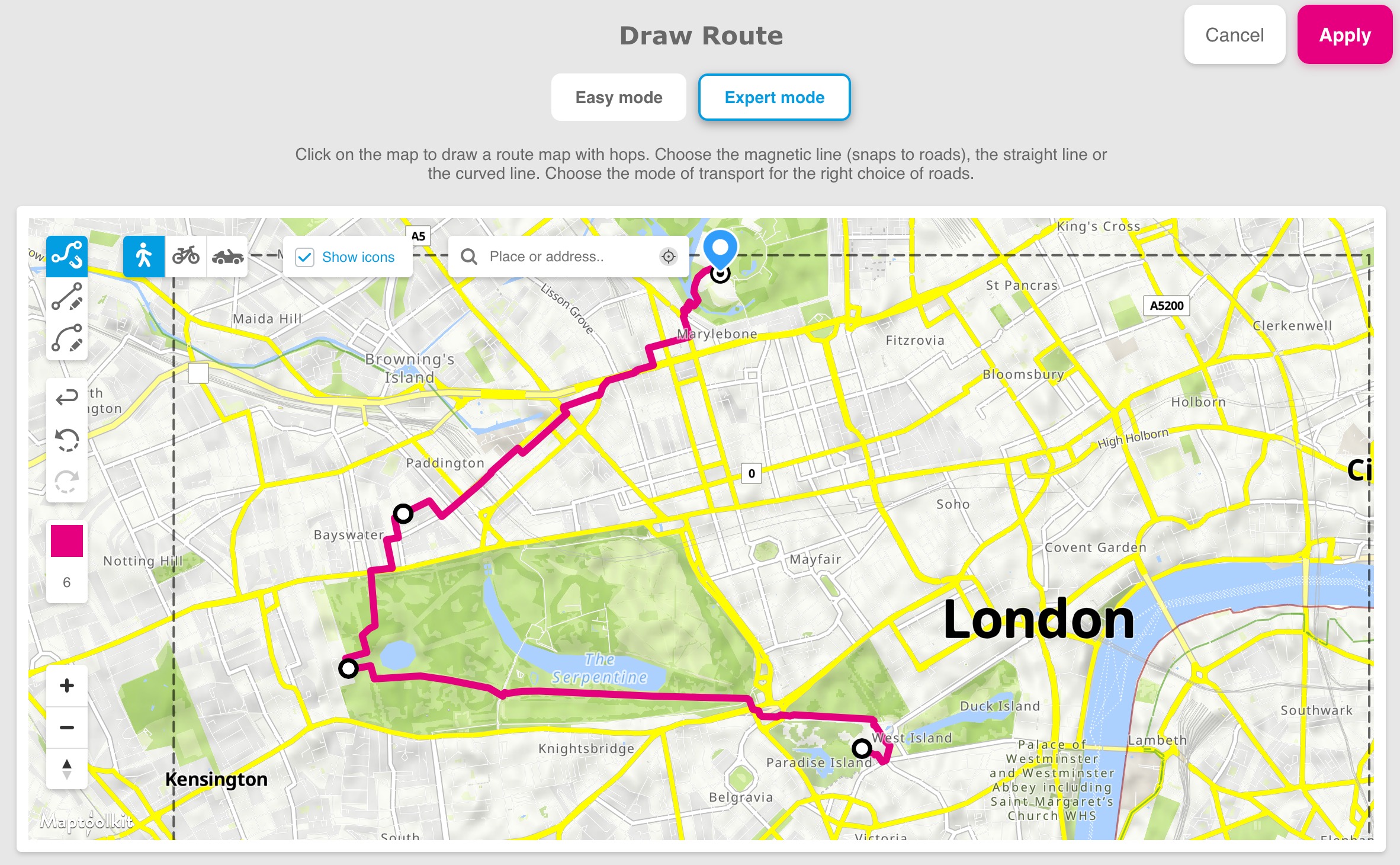 Uzman mod daha fazla özelleştirme seçeneği sunar. Sağ üst bölümde, mevcut yollar üzerinde çizim yapan mıknatıs aracı, düz çizgiler ve duraklar arasındaki kavisli çizgiler arasında seçim yapabilirsiniz. Harita üzerinde istediğiniz noktaya tıklayarak noktalar yerleştirebilir ve çizilmiş çizgileri sürükleyerek ara duraklar ekleyebilirsiniz. Ayrıca rota çizgisinin rengini ve kalınlığını da daha en baştan ayarlayabilirsiniz.