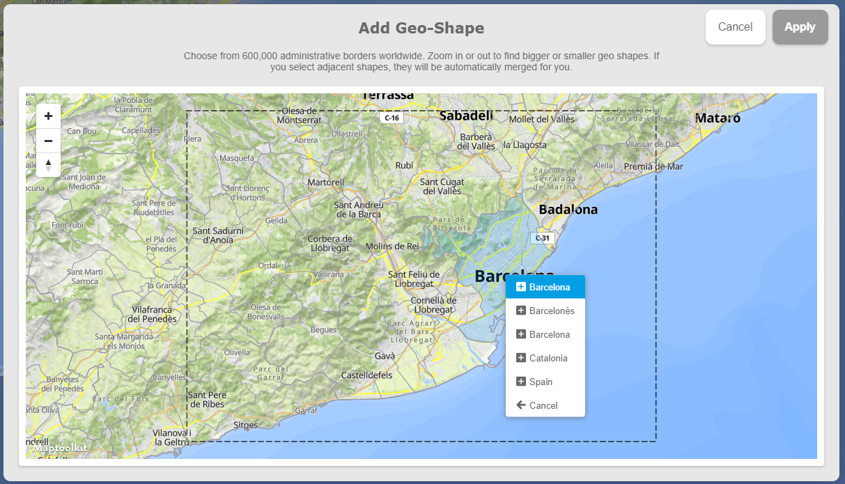 Evet. Veri tabanımızdaki şekilleri aramak için “Şekil Ekle” düğmesini kullanabilirsiniz. Bu alanları doğrudan vurgulayabilir ya da seçtiğiniz şekle odaklanan bir harita oluşturmak için tersine çevirebilirsiniz.