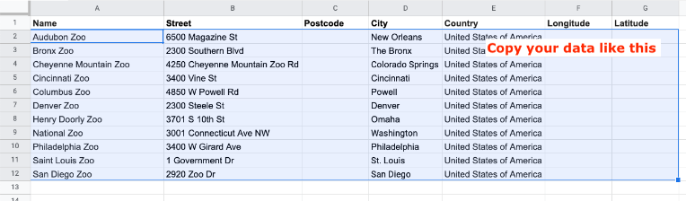 Verileri, geocoding aracımıza kolayca kopyalayıp yapıştırabilmek için kendi tablonuzda da aynı sütun düzenini kullanın.