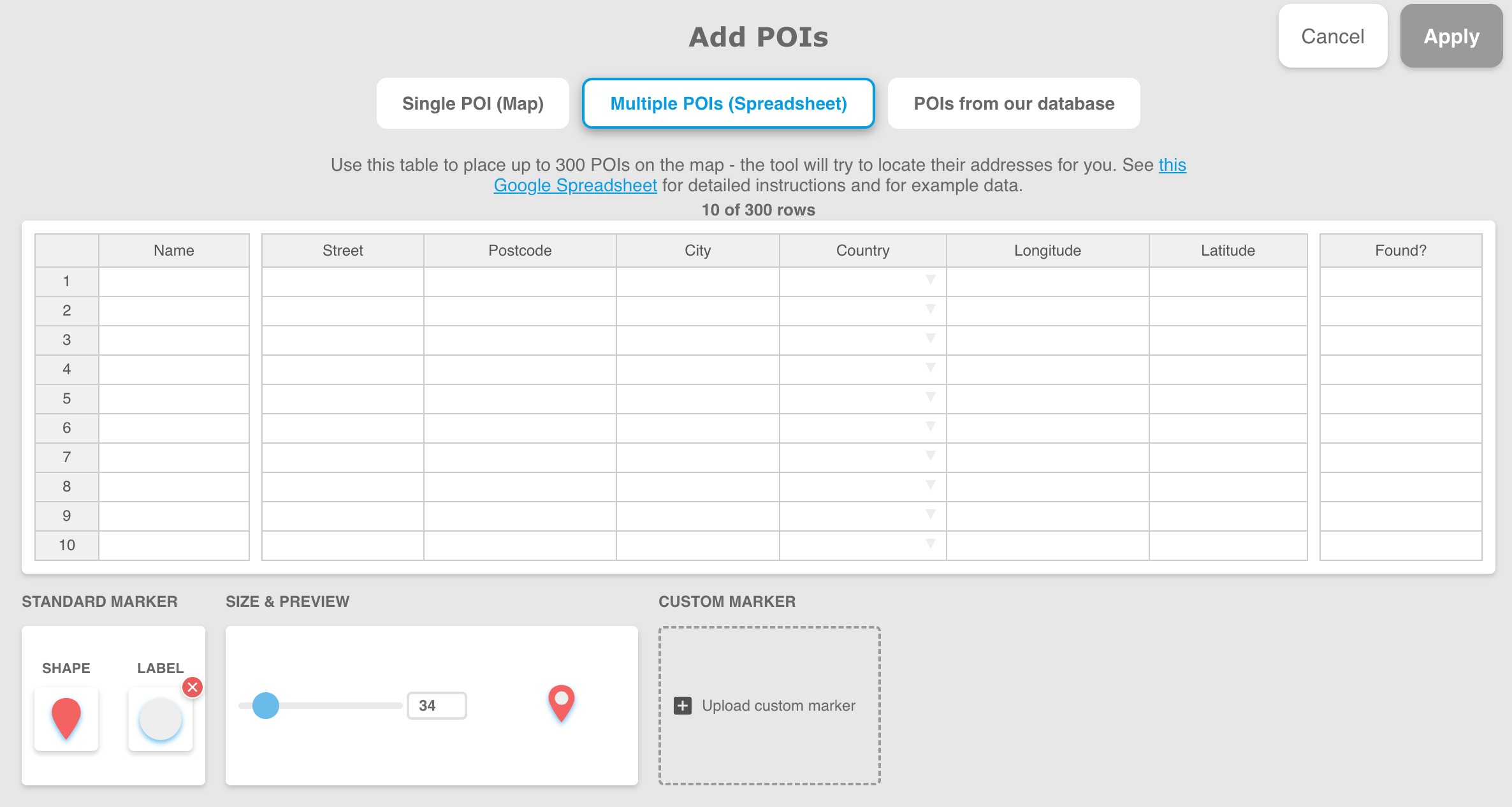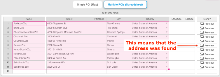 Bu tabloyu, Excel veya Google Tablosu verilerinizi kopyalayıp yapıştırmak ve geocode etmek için kullanabilirsiniz. Sistemimizin sonuç bulabilmesi için minimum gereklilik Boylam + Enlem ya da Posta Kodu/Şehir + Ülke bilgisidir. POI’lerinize ve Photoshop/Illustrator katmanlarına ad vermek için isteğe bağlı “Ad” sütununu kullanabilirsiniz. Her satır ayrı bir katman olarak oluşturulur. “Bulundu mu?” sütununu kullanarak geocoding motorumuzun doğru sonucu bulup bulmadığını önizlemede kontrol edebilirsiniz.