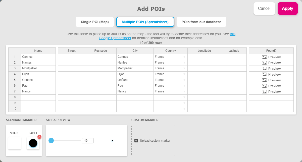 Şehir adı hâlâ görünmüyorsa şu adımları izleyin: İçerik Ekle > POI Ekle > Birden fazla POI (Tablo) > şehir adlarını “Ad” sütununa girin > şehir adını “Şehir” alanına yazın ve “Ülke” bilgisini ekleyin > sol alttaki “Şekil” seçeneğine tıklayın > daireyi seçin ve rengi şeffaf yapın (hazır renkler içinde sağ alttaki seçenek) > Uygula > “Etiket” seçeneğine tıklayın > doldurduğunuz daireyi seçin ve hazır renklerden siyahı seçin > Uygula > Boyutu 10 olarak ayarlayın > Uygula